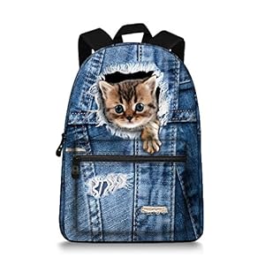 15.5 inch Cute Denim Cat Backpack Canvas Casual Laptop School Backpack Rucksack